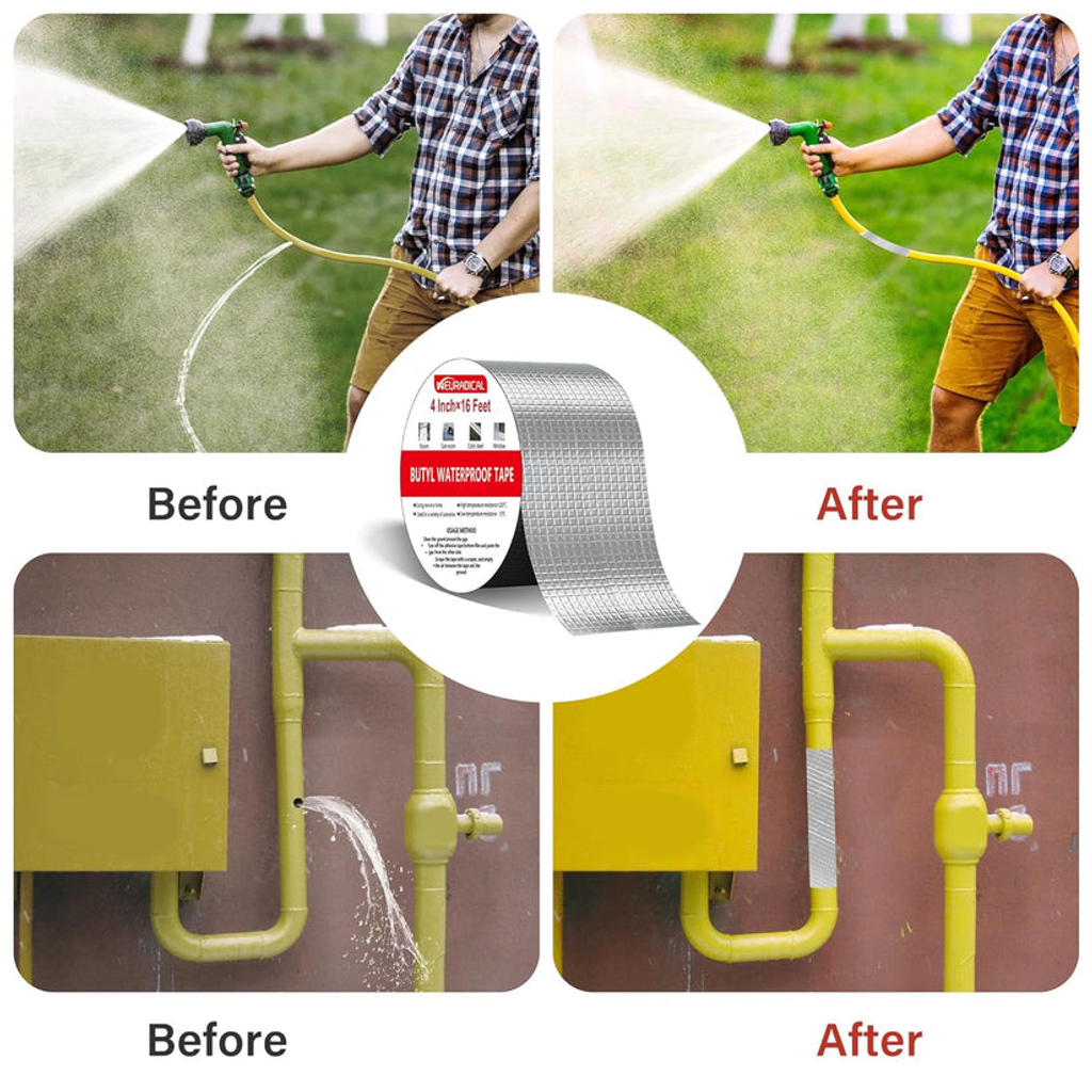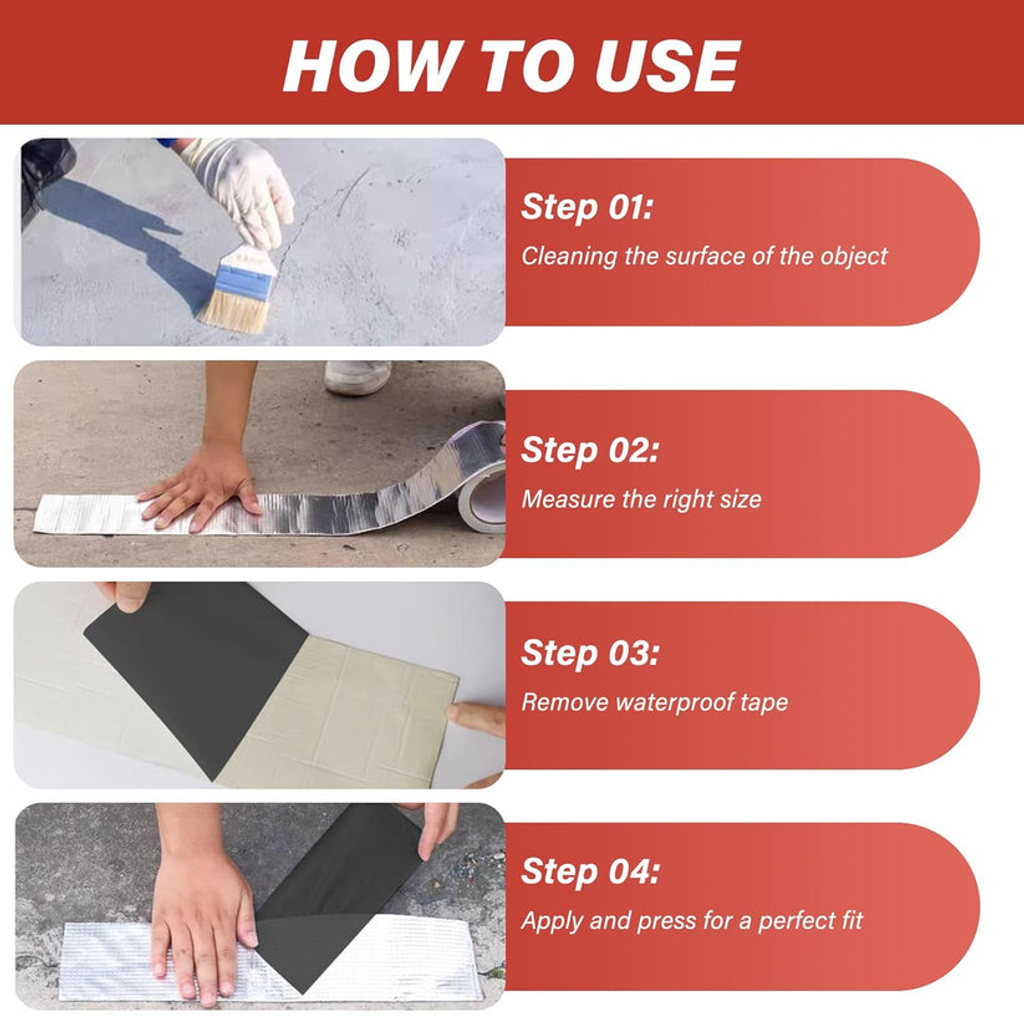 Aplique facilmente e a fita vai selar qualquer vazamento, resistente à água, calor e raios UV. Funciona em telhados, canos e até no seu carro!